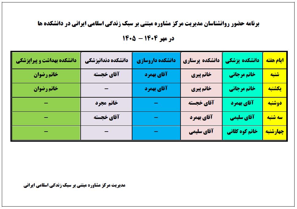 برنامه حضور روانشناسان مدیریت مرکز مشاوره مبتنی بر سبک زندگی اسلامی ایرانی در دانشکده ها در نیمسال اول 1405-1404 گروه خبری : اطلاعیه ها کد خبر : 20755 کلمات کلیدی