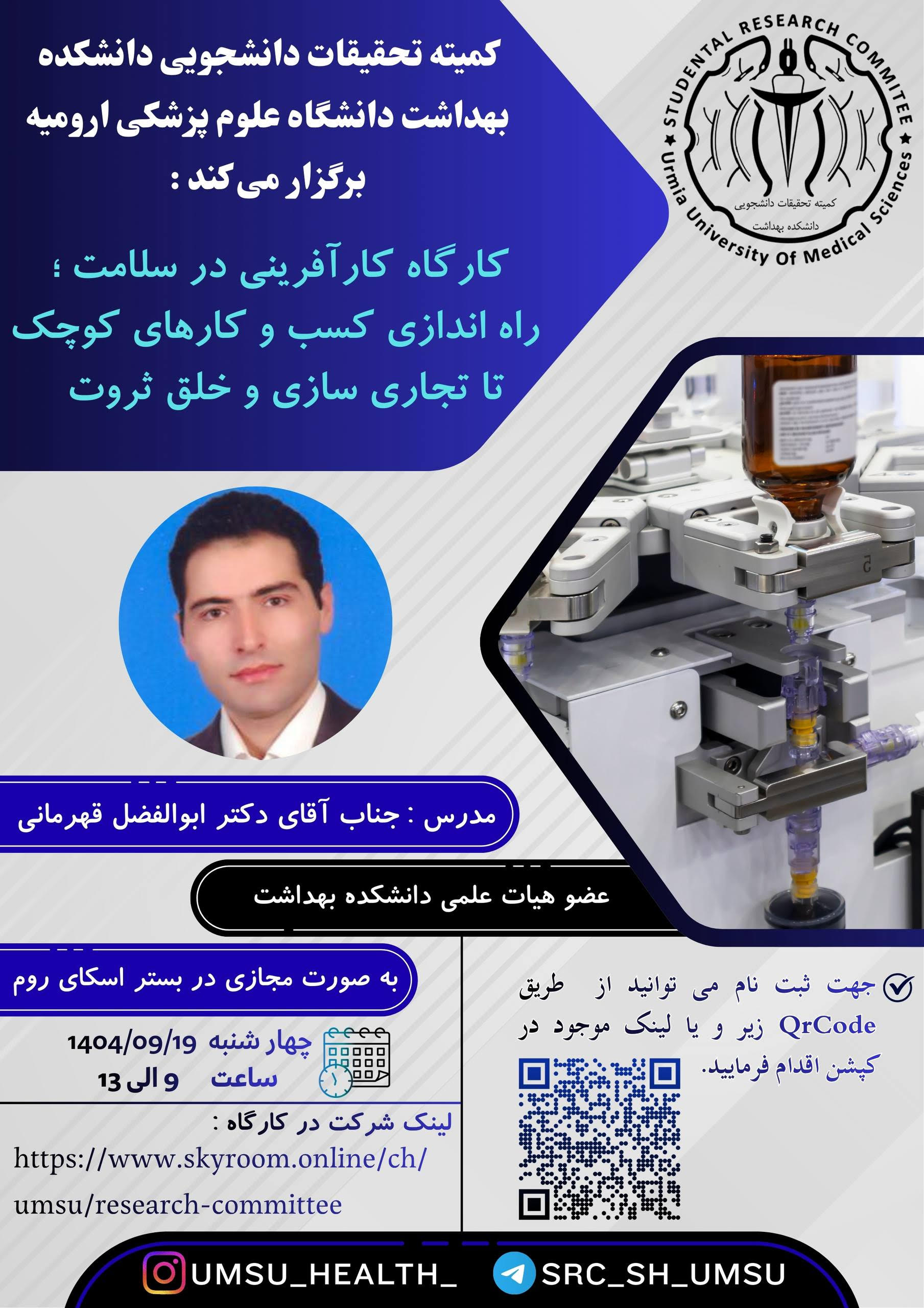 کمیته تحقیقات دانشجویی دانشکده بهداشت ارومیه برگزار می کند: ادامه کارگاه کارآفرینی در سلامت، روز چهارشنبه مورخ 1404/10/03 از ساعت 9:00 الی 13:00، به صورت مجازی در بستر اسکای روم