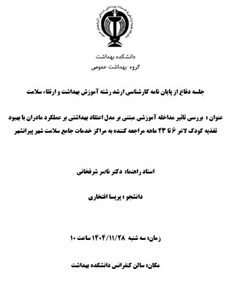 جلسه دفاع از پایان نامه کارشناسی ارشد خانم پریسا افتخاری در رشته آموزش بهداشت و اقتصاد سلامت، تحت عنوان" بررسی تاثیر مداخله آموزشی مبتنی بر مدل اعتقاد بهداشتی بر عملکرد مادران با بهبود تغذیه کودک لاغر 6 تا 23 ماهه مراجعه کننده به مراکز خدمات جامع سلامت شهر پیرانشهر " به راهنمایی جناب آقای دکترشرفخانی روز سه شنبه مورخ 1404/11/28، ساعت 10 در سالن کنفرانس دانشکده بهداشت برگزار خواهد شد.